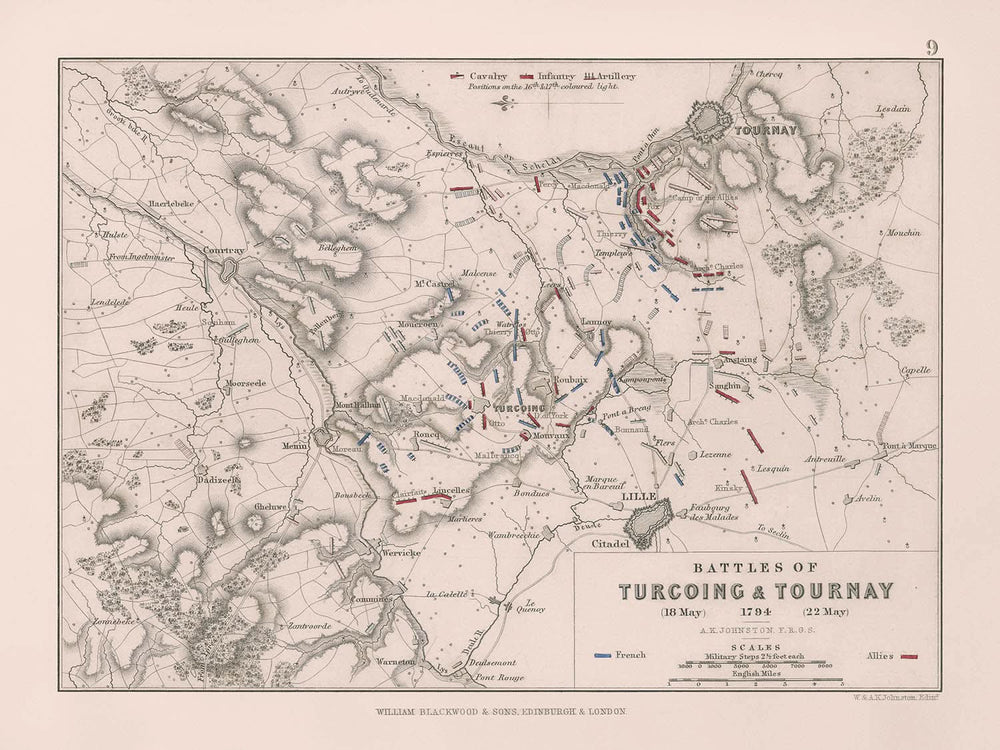 Die Kunstfertigkeit von Johnston spiegelt sich in dieser Karte in der fesselnden Darstellung militärischer Formationen wider, zusammen mit einer faszinierenden Farbpalette, die die Ära, die strategischen Dispositionen und die taktischen Erzählungen widerspiegelt. Die ätherische Mischung aus satten Pigmenten auf dem zart schraffierten Relief bietet eine umfassende Perspektive auf diese entscheidenden Schlachten. Diese Aufmerksamkeit für die Farbwahl und Präzision macht sie zu einer exquisiten Anschaffung für Geschichtsliebhaber oder diejenigen, die kunstvolle, historische Kunst schätzen.