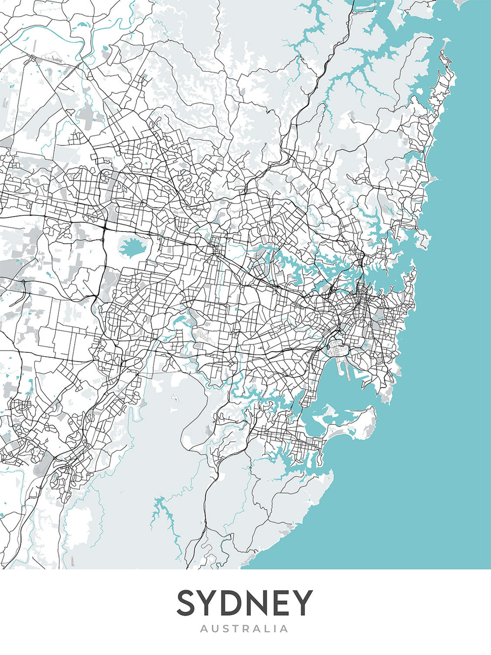 Diese Karte ist perfekt für alle, die Sydney, Karten oder beides lieben. Es ist eine großartige Möglichkeit, mehr über die Stadt und ihre Umgebung zu erfahren, und es ist außerdem ein wunderschönes Kunstwerk, das jedem Zuhause oder Büro einen Hauch von Stil verleiht.