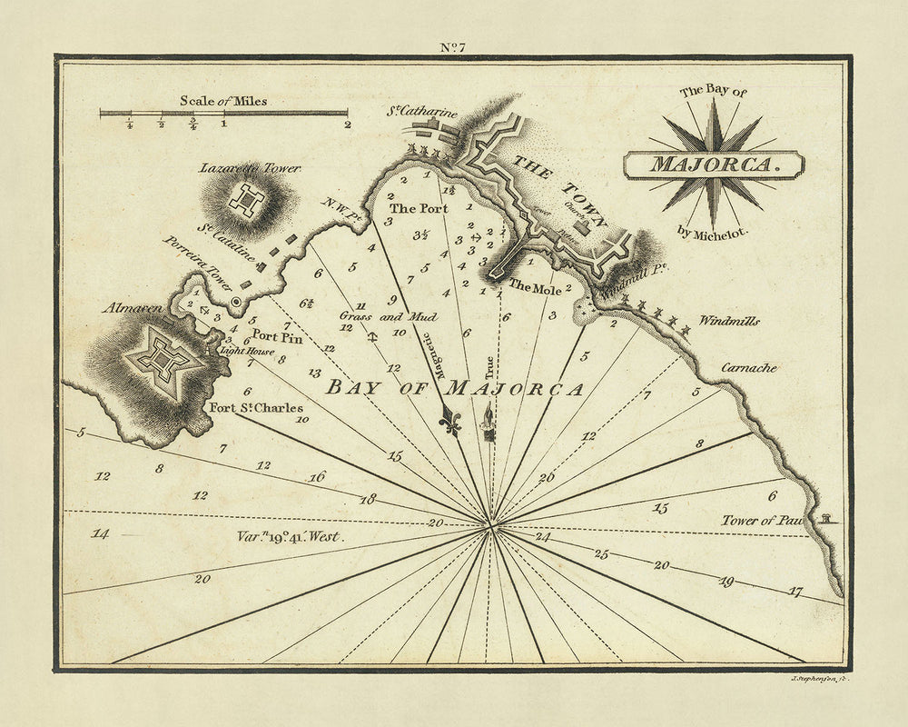 Alter Seekarten von Mallorca von Heather, 1802: Lazaretturm, Porreira-Turm, Almacen