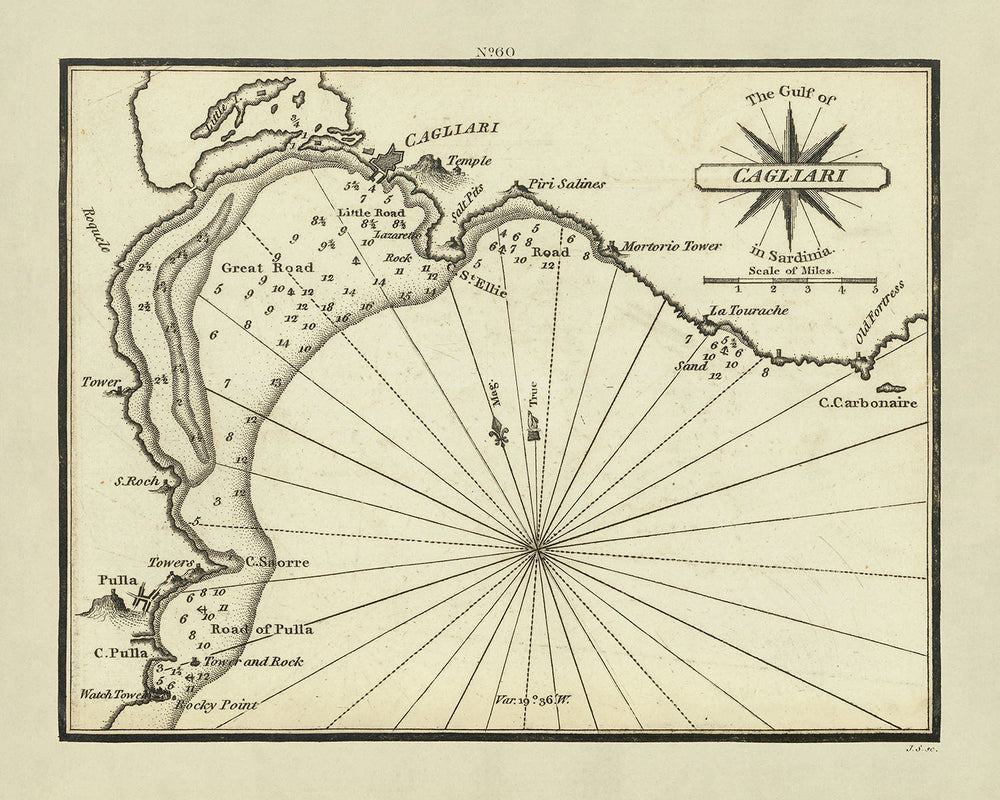 Der Golf von Cagliari, strategisch an der Südküste Sardiniens gelegen, wird auf dieser Karte wunderschön dargestellt. Die Karte zeigt die komplizierte Küstenlinie und enthüllt versteckte Buchten und weitläufige Buchten, die über die Jahrhunderte als Zufluchtsorte für Seeleute gedient haben. Indem sie die geografische Anordnung des Golfs mit solcher Genauigkeit präsentiert, einschließlich Straßen, Flüsse und Städte, bietet Heather einen Einblick in die Landschaft der Region, wie sie zu Beginn des 19. Jahrhunderts war, und bietet Erkenntnisse über ihre historische und logistische Bedeutung.