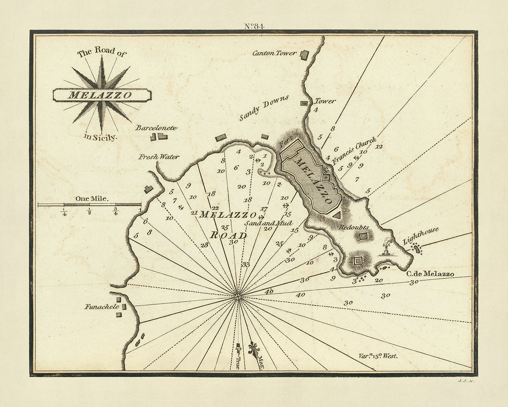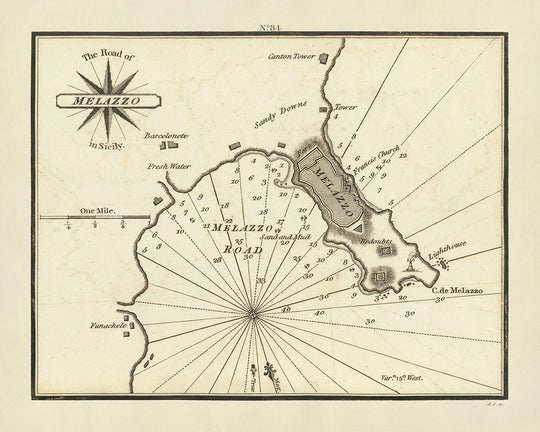 Über ihren navigationalen Nutzen hinaus dient die Karte als kulturelles und historisches Snapshot der Region zu Beginn des 19. Jahrhunderts. Sie illustriert bedeutende Wahrzeichen wie die Befestigungen von Melazzo, die ikonische St. Franziskuskirche und den strategisch wichtigen Leuchtturm. Diese Merkmale helfen nicht nur bei der Navigation, sondern spiegeln auch die historische Bedeutung von Melazzo als befestigten maritimen Außenposten wider. Die Darstellung von Straßen und Siedlungen wie Barcellona Pozzo di Gotto verbindet die maritime Landschaft mit dem terrestrischen Leben und überbrückt Meer und Land.