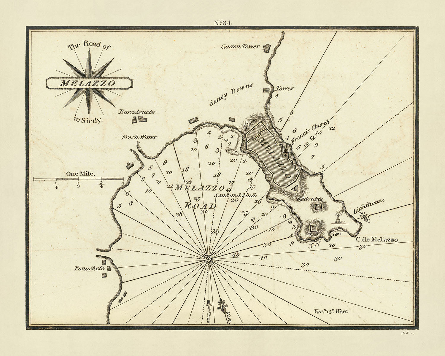 Alter Golf von Melazzo, Sizilien Seekarte von Heather, 1802: Befestigungen, Leuchtturm, Strömungen