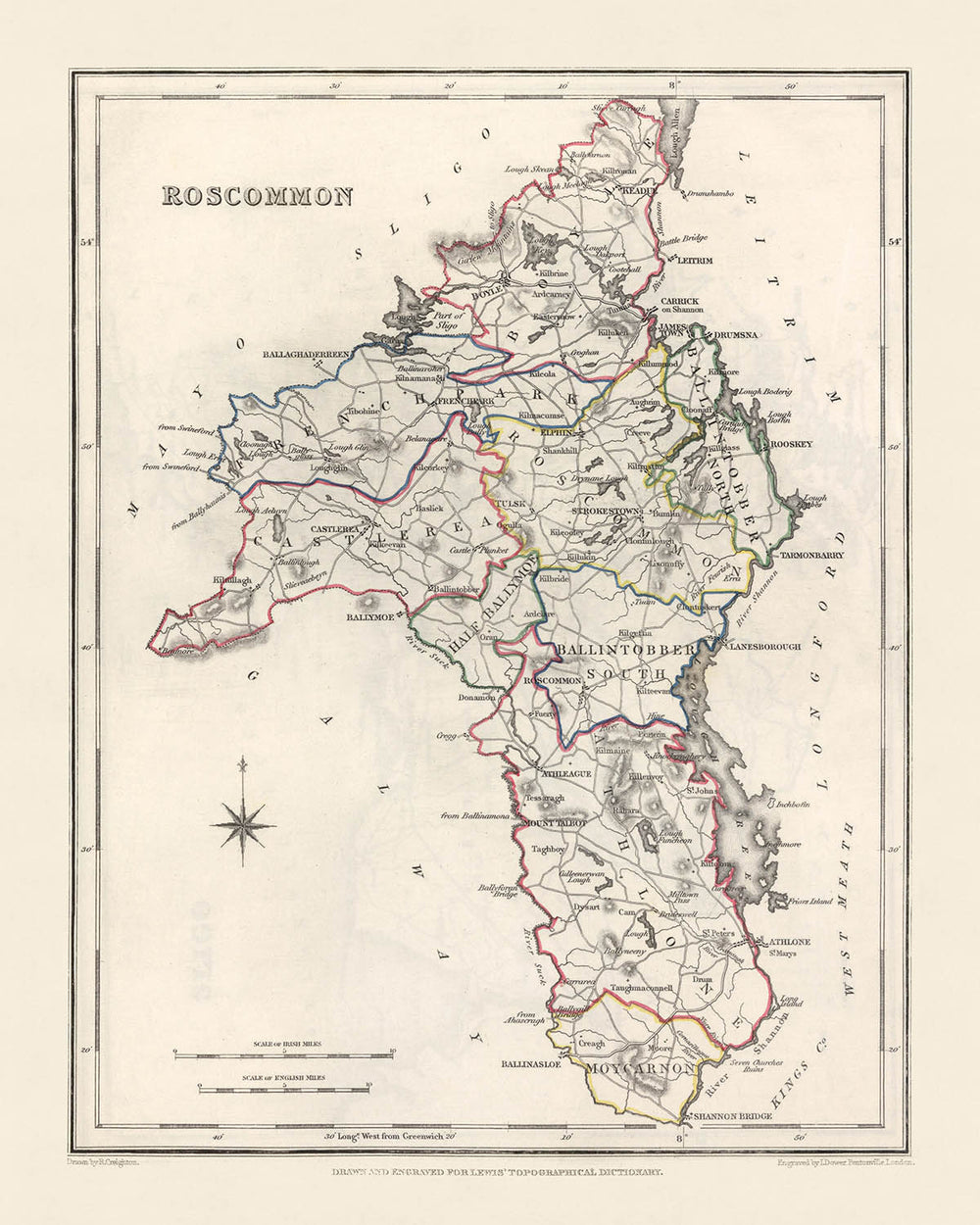 Entdecken Sie den historischen Charme des County Roscommon mit der Karte von Samuel Lewis aus dem Jahr 1844