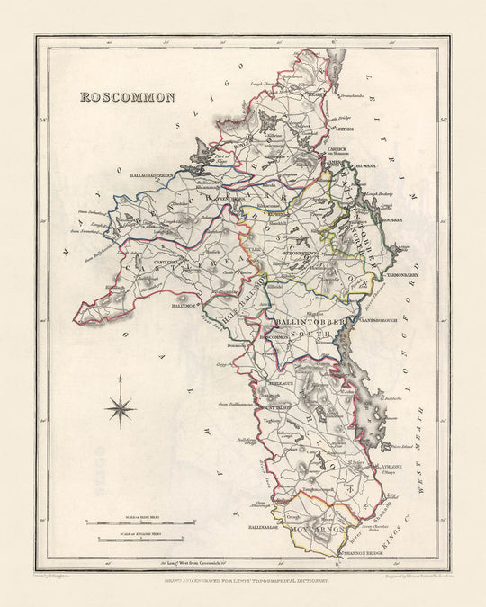 Reisen Sie zurück in die Zeit mit der exquisiten Karte des County Roscommon aus dem Jahr 1844, die sorgfältig von dem renommierten Kartenmacher des 19. Jahrhunderts, Samuel Lewis, erstellt wurde. Bekannt für seine Präzision und Detailgenauigkeit, bietet Lewis' Karte nicht nur einen Einblick in die geografische Anordnung der damaligen Zeit, sondern fasst auch eine Epoche von tiefgreifender historischer Bedeutung zusammen.