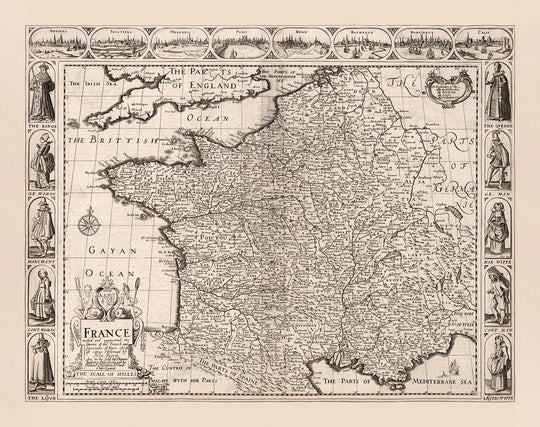 Um den Rand der Karte herum sind einige wunderbare Gravuren von französischen Städten wie Calais, Paris, Bordeaux und Poitiers - sowie Zeichnungen der französischen Menschen, einschließlich des Königs, der Königin, eines 'Gentleman' und eines 'Händlers'.