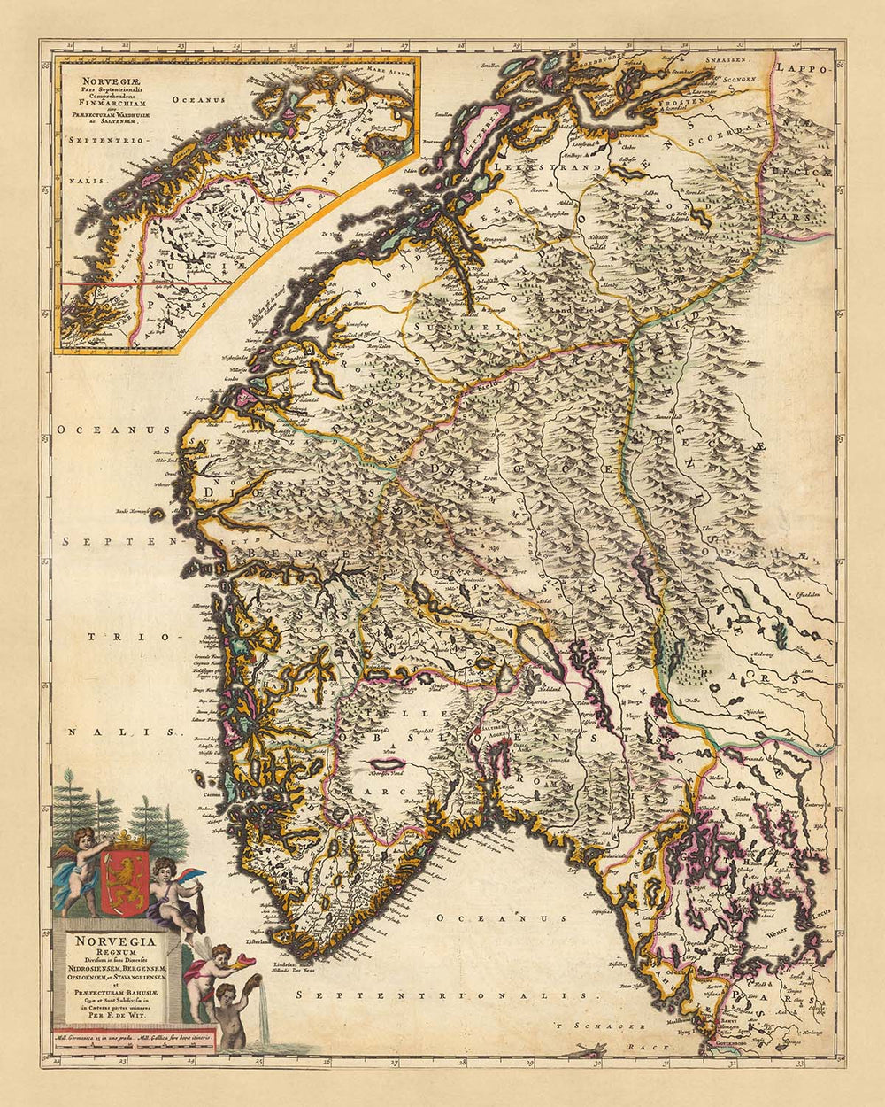 Alte Karte von Norwegen von Visscher, 1690: Oslo, Trondheim, Bergen, Stavanger, Jotunheimen Nationalpark