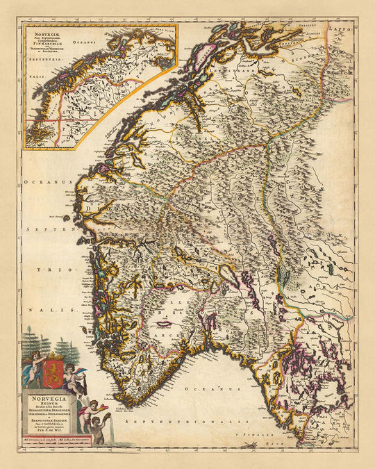 Diese exquisite Karte „Norvegia regnum: divisum in suos dioeceses Nidrosiensem, Bergensem, Opsloensem, et Stavangriensem et praefecturam Bahusiae quae et sont subdivisae in in caeteras partes, Minores“ ist ein Beweis für die sorgfältige Handwerkskunst von Nicolaes Visscher II., einem renommierten Kartenmacher aus dem Goldenen Zeitalter der Niederlande. Die 1690 erstellte Karte stellt eine detaillierte Darstellung Norwegens dar und bietet einen Einblick in die historische und politische Landschaft des Landes.