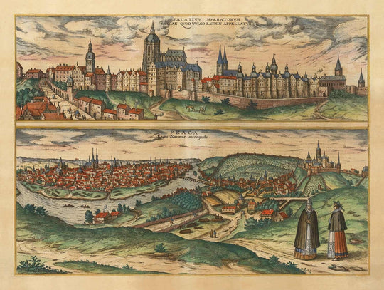 Veröffentlicht 1572 von Georg Braun und Frans Hogenberg, ist dies wahrscheinlich die erste (und seltenste) gedruckte Karte von Prag, der Hauptstadt der Tschechischen Republik oder Tschechien. Wenn Shakespeare Prag besucht hätte, hätte es so ausgesehen. Diese Karte wurde erstmals in Civitates Orbis Terrarum - den Städten der Welt - veröffentlicht, einem kartografischen Meisterwerk mit 546 Karten.