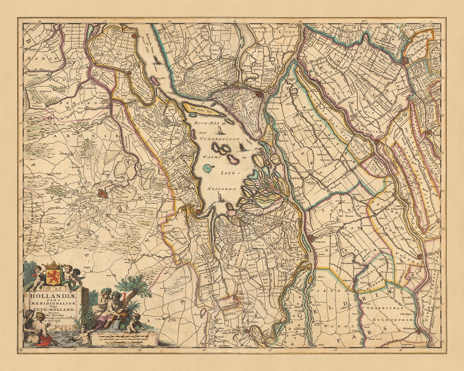 Alte Karte von Südholland von Visscher, 1690: Dordrecht, Breda, Roosendaal, Gouda, Nationalpark De Biesbosch