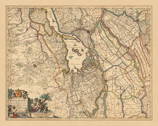 Zusätzlich zu diesen wichtigen Orten wimmelt es auf der Karte von zahlreichen anderen Städten, Sehenswürdigkeiten und geografischen Merkmalen, von denen jede ihre eigene historische Bedeutung hat. Es ist ein Beweis für die kartografischen Fähigkeiten des niederländischen Goldenen Zeitalters und die akribische Liebe zum Detail von Nicolaes Visscher II. Diese Karte ist nicht nur ein Kunstwerk; Es ist ein Fenster in die Vergangenheit und lädt Sie ein, die reiche Geschichte und Kultur Südhollands zu erkunden.