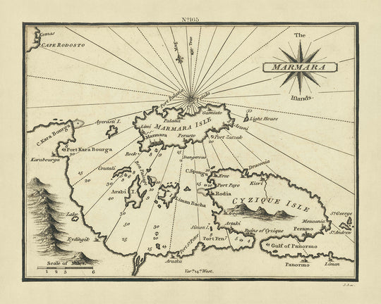 Kartografische Details und Stil Mit einem scharfen Auge für Details gefertigt, weist die Karte ein präzises, nach Norden ausgerichtetes Layout auf, das typisch für die nautischen Karten der damaligen Zeit war. Sie enthält eine Maßstabsleiste und eine Legende, die ihren Nutzen und historischen Wert erhöht. Das Design und der Stil spiegeln Heathers Engagement für Genauigkeit und Ästhetik wider, wodurch sie nicht nur ein Navigationswerkzeug, sondern auch ein Kunstwerk ist. Die Gravur ist fein und detailliert, was eine klare Sichtbarkeit der geografischen und nautischen Elemente ermöglicht, die entscheidend für das Verständnis der strategischen Bedeutung des Marmarameeres als historische Handelsroute sind.