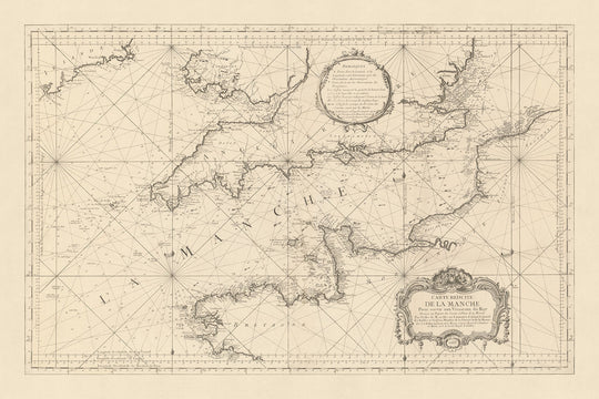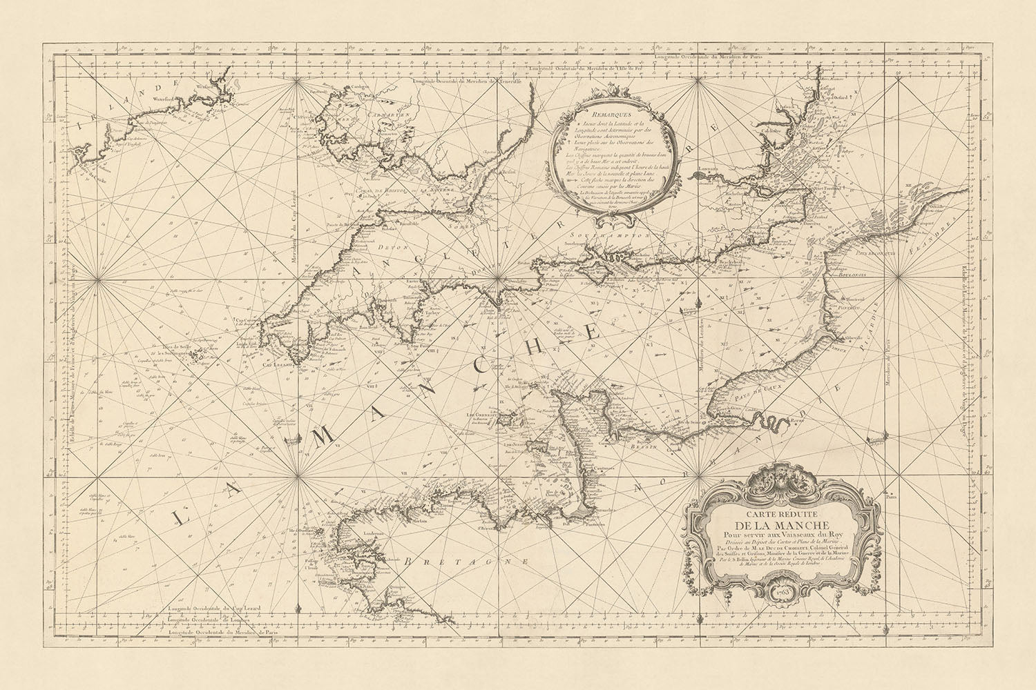 Die „Carte Réduite de la Manche“ ist nicht nur ein Navigationsinstrument, sondern ein historisches Dokument, das einen Einblick in die geopolitische Landschaft des 18. Jahrhunderts bietet. Es umreißt akribisch die Südküste der Britischen Inseln und die Nordküste Frankreichs und hebt nur die Küstenstädte hervor, darunter die geschäftigen Hauptstädte London und Paris. Die Karte wird außerdem durch die Beschriftung wichtiger Landkreise und Regionen wie Sussex, Dorset, Devon, Cornwall, Normandie, Bretagne, Picardie und Flandern bereichert. Diese sorgfältige Auswahl an Details bietet Einblicke in die Bereiche von strategischer und nautischer Bedeutung in einer Zeit, in der die Kontrolle der Meere von entscheidender Bedeutung für die nationale Macht und die koloniale Expansion war.