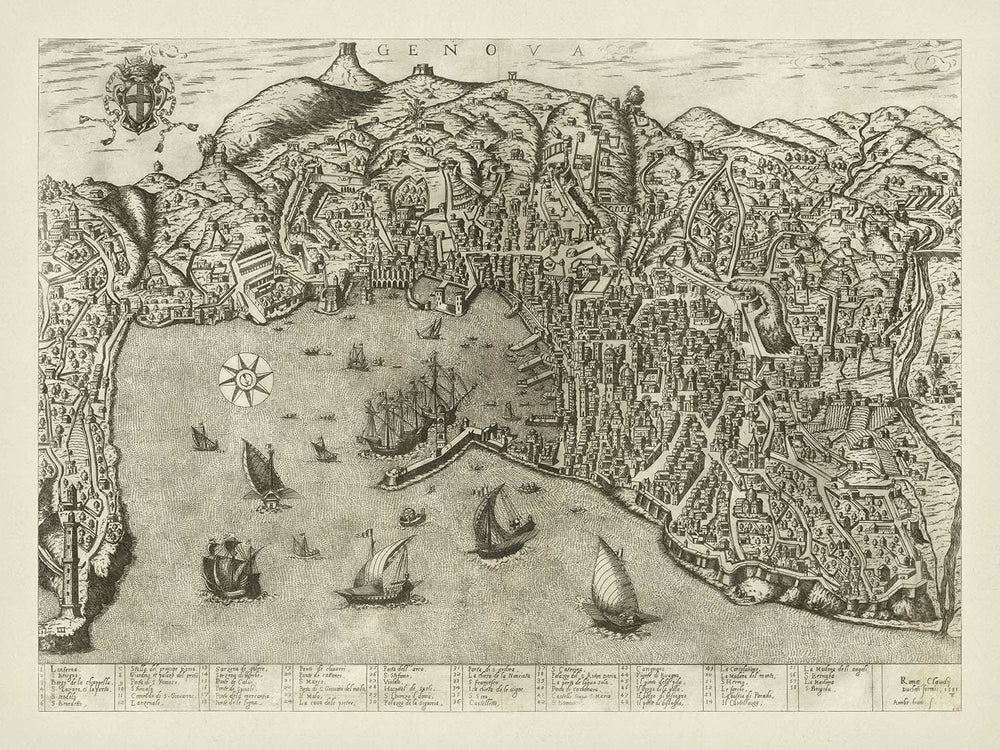 Tauchen Sie ein in die komplexe Stadtlandschaft, die auf dieser Karte dargestellt ist, wo gewundene Straßen und geschäftige Viertel das lebendige Leben des Renaissance-Genuas enthüllen. Die Legende der Karte, die 58 Sehenswürdigkeiten auflistet, dient als Führer zu den architektonischen und kulturellen Wahrzeichen der Stadt. Von großen Kathedralen bis zu geschäftigen Marktplätzen erzählt jeder Standort eine Geschichte des reichen und vielfältigen Erbes Genuas. Diese Karte dient nicht nur als historisches Dokument, sondern auch als künstlerische Feier des einzigartigen Charakters der Stadt.