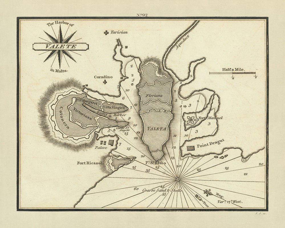 Diese Karte ist nicht nur ein Navigationswerkzeug, sondern auch ein historisches Dokument, das das Wesen der maritimen Bedeutung von Valletta einfängt. Die Einbeziehung von Tiefenmessungen und Navigationshilfen wie Kompassrosen und Wasserkanälen unterstreicht ihre Nützlichkeit für Seeleute der damaligen Zeit. Darüber hinaus bietet die detaillierte Darstellung von Küstenstädten und Häfen rund um Valletta, wie Floriana und Cospicua, einen umfassenden Blick auf die städtische und maritime Konfiguration der Region während einer entscheidenden Ära in der Geschichte des Mittelmeers.