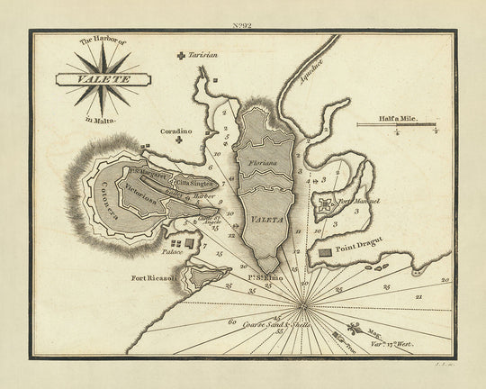 Die Karte ist reich an geografischen und historischen Daten und hebt wichtige Wahrzeichen und Infrastrukturen von Valletta hervor. Sie zeigt bedeutende Befestigungen wie Fort St. Angelo, Fort Ricasoli und Fort Manuel, die eine entscheidende Rolle in der Verteidigung und Entwicklung von Valletta spielten. Darüber hinaus gibt die Karte andere bedeutende Orte wie den Palast des Großmeisters und die St. John's Co-Kathedrale an und bietet Einblicke in die architektonische und kulturelle Landschaft der damaligen Zeit.