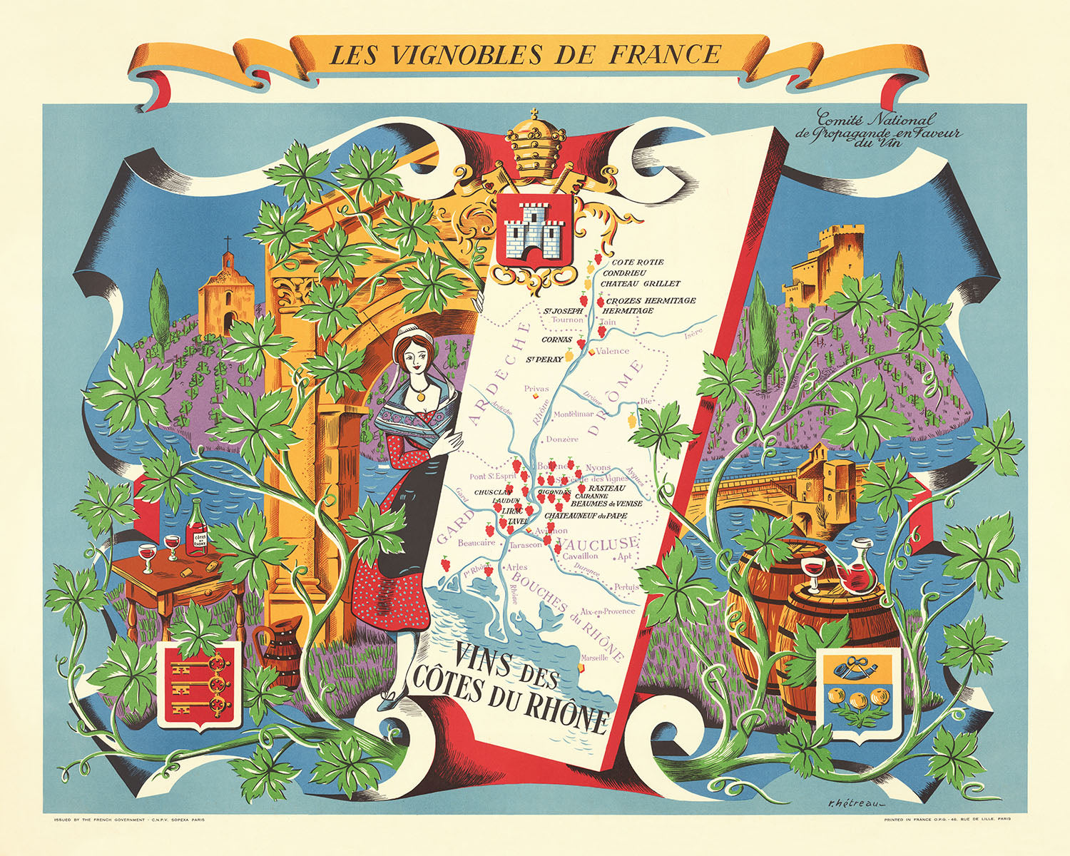 - Weinregionen gekennzeichnet (z. B. Côte Rôtie, Condrieu, Châteauneuf-du-Pape)