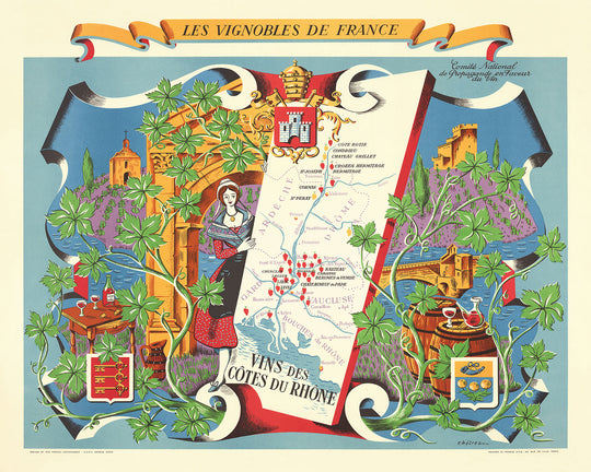 Das Design der Karte ist eine harmonische Mischung aus kartografischer Präzision und künstlerischer Eleganz. Sie zeigt Weintrauben, wobei rote Trauben Rotweine und gelbe Trauben Weißweine darstellen, verwoben mit üppigen Weinblättern und Ranken. Die Karte wird von einer Windrose, einem Segelschiff und einem Schloss eingerahmt, was ihren malerischen Charme noch verstärkt. Diese Elemente verstärken nicht nur die ästhetische Anziehungskraft der Karte, sondern symbolisieren auch das reiche Erbe und die Tradition des Weinbaus in der Region Côte du Rhône.