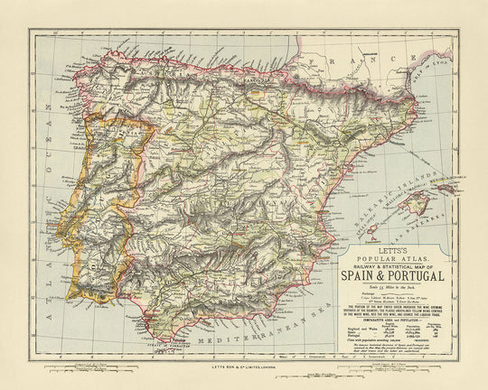 Erstellt im Jahr 1883 von der angesehenen Firma Letts Son & Co., steht "Letts's Popular & Statistical Map of Spain & Portugal" als Zeugnis für die kunstvolle Kartografie in einer entscheidenden Ära der iberischen Geschichte. Diese Karte, mit ihrer detaillierten Darstellung der politischen und geografischen Landschaft, fängt das Wesen Spaniens und Portugals in einer Zeit bedeutender Veränderungen ein. Das klassische Design, geschmückt mit einem dekorativen Rahmen und einer auffälligen Titelkartusche, erhöht den historischen Wert und macht sie nicht nur zu einem Navigationswerkzeug, sondern zu einem Kunstwerk, das die Ästhetik ihrer Zeit widerspiegelt.