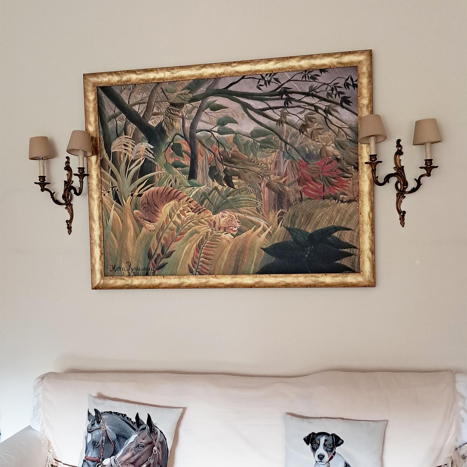 Die Art und Weise, wie Rousseau das Imaginäre mit dem Realistischen vermischt und mit Licht und Schatten spielt, vermittelt ein Gefühl von Geheimnis und Bewegung. Der Kontrast des wilden Tigerauges vor dem Hintergrund eines bedrohlichen Himmels und sintflutartigen Regens macht dieses Kunstwerk zu einem Gesprächsthema und einem schönen Blickfang in jedem Raum.