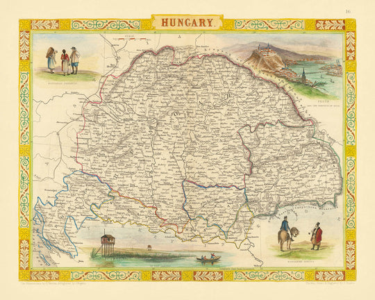 John Tallis' Werk zeichnet sich durch seine aufwendigen Vignetten aus, und diese Karte ist keine Ausnahme. Sie zeigt eindrucksvolle Szenen von ungarischen Adligen und Bauern, neben einer malerischen Ansicht von Pesth und der Festung Buda. Diese Illustrationen bieten einen Einblick in das soziale Gefüge Ungarns in dieser Zeit und spiegeln die Traditionen und das tägliche Leben seiner Menschen wider. Die Einbeziehung einer Szene am Donaufluss bereichert die Karte weiter und hebt die Bedeutung dieser wichtigen Wasserstraße in der Geschichte und Wirtschaft Ungarns hervor.