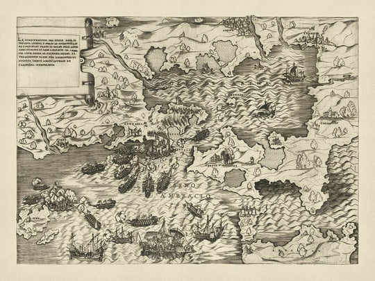 Die Kunstfertigkeit Salamancas strahlt in dem Design der Karte hervor, mit akribischen Gravuren, die den chaotischen Tanz der Schiffe und die strategischen geografischen Merkmale der Bucht von Artha illustrieren. Die unterschiedlichen Linienstile vermitteln Wassertiefen und führen den Betrachter durch flache Buchten und tiefe, offene Gewässer. Diese Liebe zum Detail verbessert nicht nur die ästhetische Anziehungskraft der Karte, sondern unterstreicht auch ihre Nützlichkeit als Werkzeug zum Verständnis maritimer Manöver.