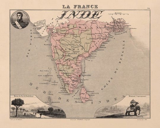 A. Vuillemin war bekannt für seine Fähigkeit, wissenschaftliche Kartographie mit künstlerischem Flair zu verbinden, und diese Karte ist ein typisches Beispiel seines Schaffens. Jede Region—Pondichéry, Karikal, Mahé, Yanaon und Chandernagor—wurde sorgfältig dargestellt, mit scharf definierten Grenzen, um die französische Präsenz im weiten britisch kontrollierten indischen Subkontinent hervorzuheben. Vuillemins Werk wird zudem durch die Einbeziehung lokaler Szenen, bemerkenswerter Persönlichkeiten und Wappen, die alle akribisch illustriert sind, um die einzigartige Identität jeder Enklave hervorzurufen, weiter ausgezeichnet. Seine Liebe zum Detail verbessert nicht nur die ästhetische Anziehungskraft der Karte, sondern dient auch als wertvolles historisches Dokument einer vergangenen Ära.