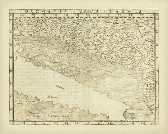 Der geografische Umfang dieser Karte umfasst einen Großteil des heutigen Kroatien sowie Teile von Slowenien, Bosnien und Herzegowina, Montenegro, Albanien und sogar einen Blick auf Venedig und Istrien. Das Adriatische Meer, das als "Mare Adriaticum" dargestellt ist, dominiert die Szene, seine Küstenlinie wird durch den Archipel dalmatinischer Inseln unterbrochen. Im Landesinneren erheben sich stilisierte Gebirgszüge dramatisch, während Flüsse zum Meer mäandrieren und sowohl die physische Pracht als auch die strategische Bedeutung der Region widerspiegeln. Die sorgfältige Abgrenzung von Grenzen und natürlichen Merkmalen illustriert die Komplexität dieses Schnittpunkts zwischen Ost und West.
