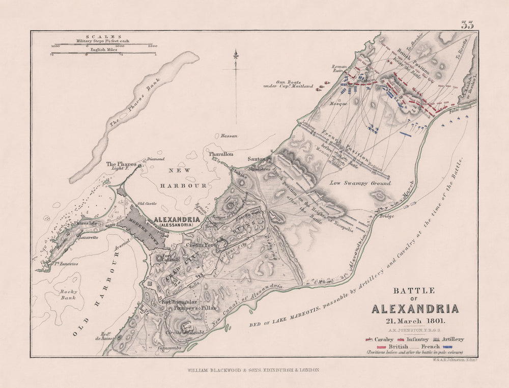 Die Künstler dieser Karte, W. & AK Johnston, waren im späten 18. und frühen 19. Jahrhundert für ihre detaillierten und präzisen kartografischen Arbeiten bekannt. Die lebendige Darstellung der militärischen Bewegungen in der Schlacht von Alexandria zeugt von ihrer Meisterhaftigkeit. Diese Lithografie ist besonders bemerkenswert für die Darstellung der britischen und französischen Militärstrategien, einschließlich Kavallerie, Infanterie und Artillerie, die sorgfältig farblich gekennzeichnet wurden, um die Positionen vor und nach dem Zusammenstoß anzuzeigen.
