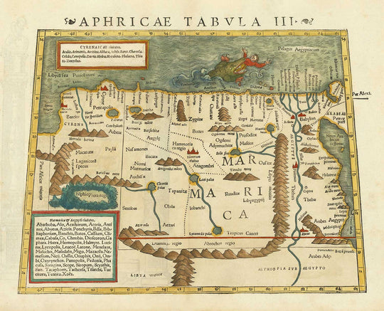 Eine detaillierte Karte für ihre Zeit, die Berge in den Ländern zeigt und den Nil, der von Süden zum Mittelmeer fließt, beschriftet mit "Pelagus Aegyptiacum." Das Meer von Ägypten.
