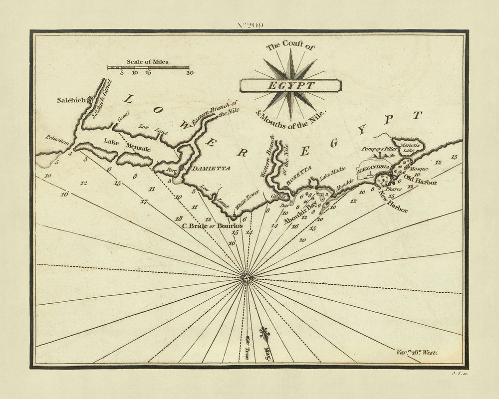 Das Design der Karte ist sowohl funktional als auch ästhetisch ansprechend und zeigt einen klassischen Kompassrose sowie eine Maßstabsangabe in Meilen, die die kartografischen Standards der Epoche veranschaulichen. Diese Elemente tragen nicht nur zur Nützlichkeit der Karte bei, sondern auch zu ihrem Charme, indem sie das Wesen der maritimen Erkundung während dieser Zeit einfangen. Die sorgfältige Darstellung der Mündungen des Nils und der umliegenden Topographie bietet ein lebendiges Porträt der Geographie der Region und macht sie zu einem wertvollen Bildungswerkzeug für Interessierte an der natürlichen und politischen Geschichte des Gebiets.