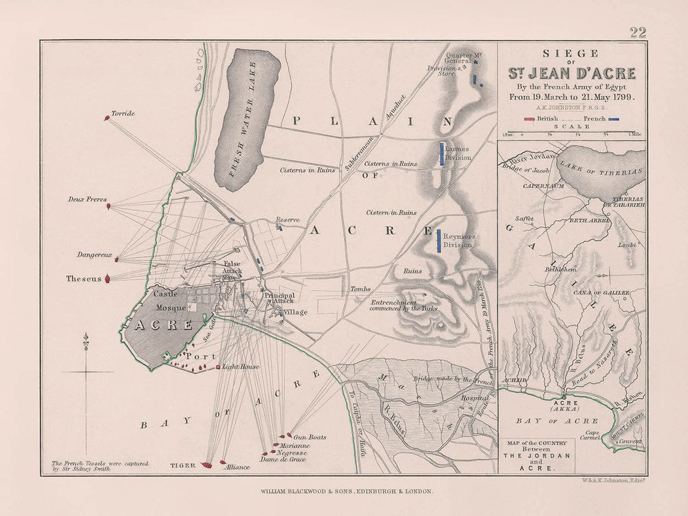 Die „Belagerung von St. Jean d'Acre durch die französische Armee in Ägypten“, 1799 von dem berühmten Künstler AK Johnston geschaffen, ist ein bemerkenswertes Stück historischer Kunst. Diese antike, handkolorierte Lithografie bietet einen detaillierten Belagerungsplan mit einer eingefügten Karte der Region zwischen dem Jordan und Akko. Sie zeigt auf wunderschöne Weise die komplizierten Positionen der französischen und britischen Streitkräfte und verwendet Schraffuren, um Reliefs anzudeuten. Diese Lithografie, gestochen von W. & AK Johnston, ist Teil eines außergewöhnlichen Atlas, der Sir Archibald Alisons „History of Europe“ begleitet und bedeutende militärische Auseinandersetzungen von 1789 bis 1815 abdeckt.