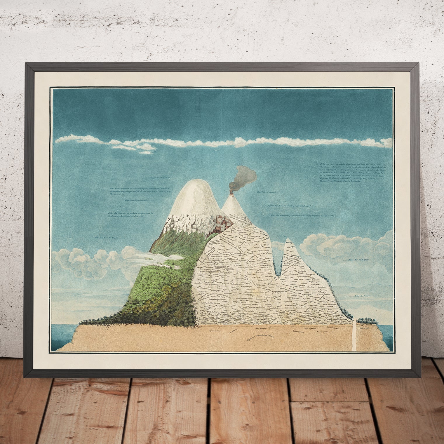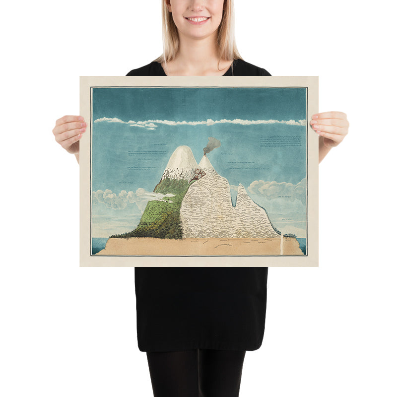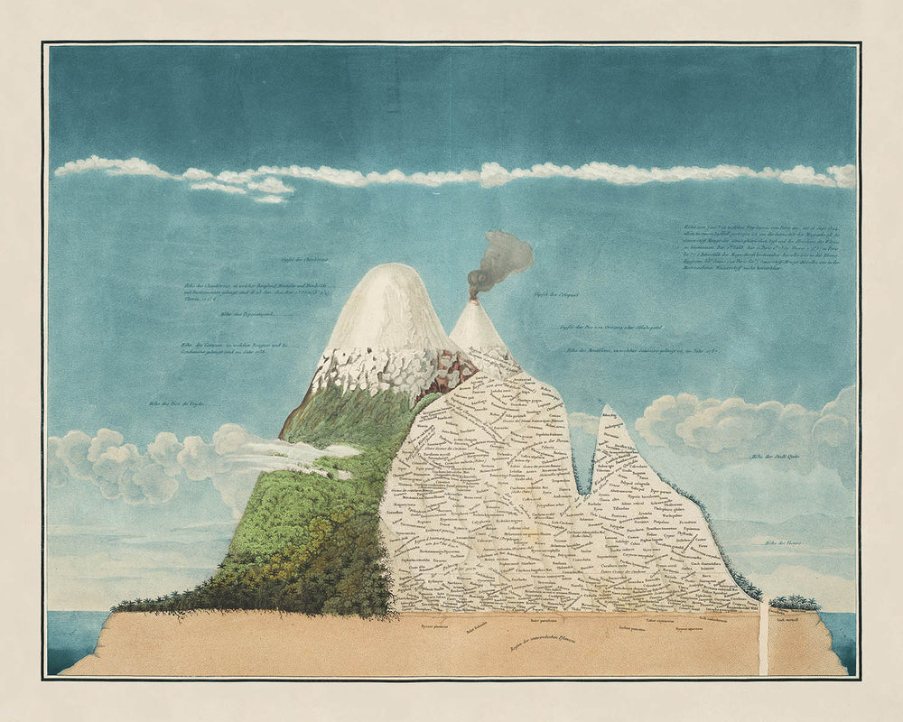 Chimborazo Volcano by Alexander von Humboldt is a landmark work of early nineteenth-century science and art, first published in 1807. Created after Humboldt’s celebrated expedition through the Andes, this antique colour lithograph distills an audacious idea: that life on Earth arranges itself in bands with altitude and climate. The image presents the Andean giant as a crisp profile, its snow-bright summit tapering into a triangulated silhouette, while an intricate weave of fine typography maps plant life up the mountain’s flanks. The result is both a lyrical portrait of Chimborazo and a revolutionary “portrait of nature” that helped establish the field of biogeography.