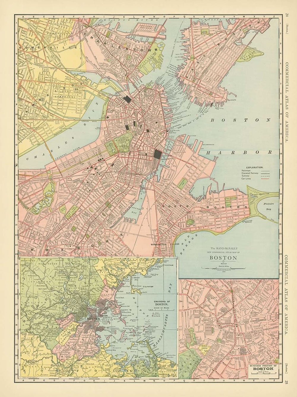 - Eingefügte Karten: Boston und Umgebung, Geschäftsviertel von Boston
