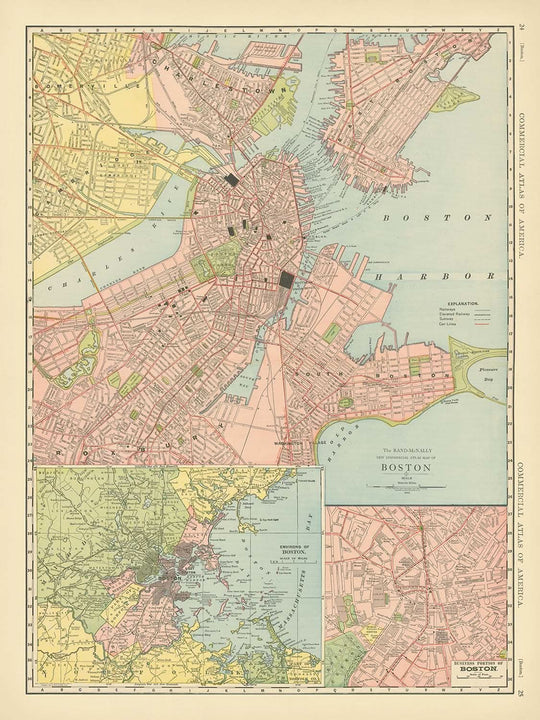 Rand McNally & Company, bekannt für ihre Präzision und Kunstfertigkeit in der Kartografie, erweckt Boston mit dieser Karte zum Leben. Ihr Ruf, einige der besten großformatigen Atlaskarten der damaligen Zeit zu erstellen, wird durch die akribische Detailliertheit und Klarheit der Darstellung deutlich. Diese Karte bildet nicht nur die Straßen der Stadt ab, sondern fängt auch das Wesen des dynamischen Wachstums Bostons und seiner Rolle als Zentrum für Handel und Kultur ein.