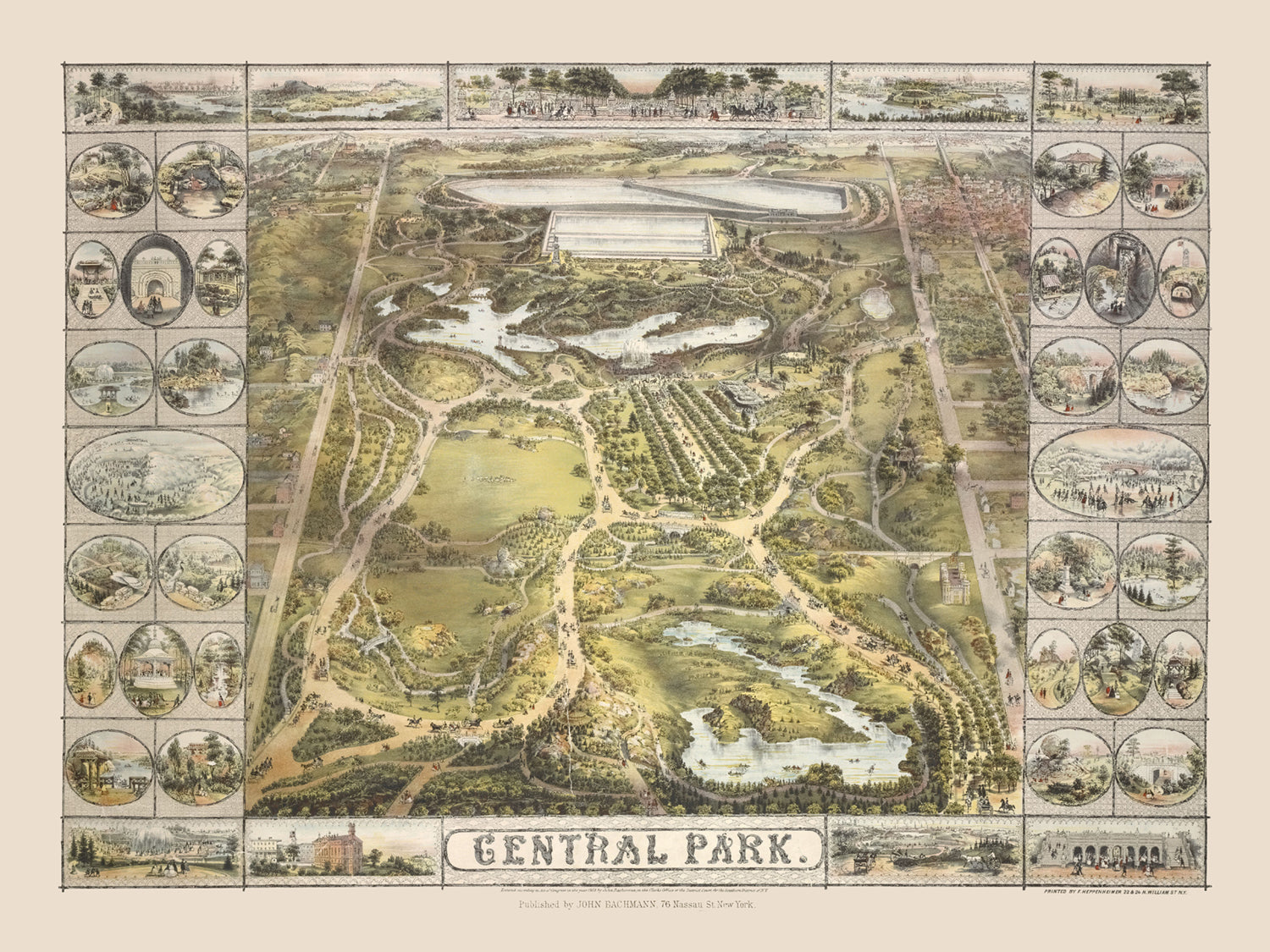 Alte Karte des Central Parks, NYC von Bachmann, 1863: Bethesda-Brunnen, Schafwiese, The Ramble, Cherry Hill