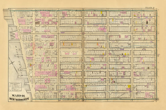 Diese exquisite handkolorierte Lithographie aus dem Jahr 1879 stellt Bezirk 16 von New York City dar und deckt das Viertel Chelsea ab. Die Karte wurde vom angesehenen Kartographen GW Bromley erstellt, der für seine detaillierten städtischen Kartografiearbeiten bekannt ist. Die Karte ist detailliert und zeigt die sorgfältige Stadtplanung der damaligen Zeit. Blockabmessungen, Wasserleitungen und sogar Hydranten sind deutlich markiert. Man kann die Präzision bei der Abgrenzung der ursprünglichen Wasserläufe und Farmlinien sowie der Bezirksgrenzen bewundern, die damals die Verwaltungsgliederung der Stadt definierten.