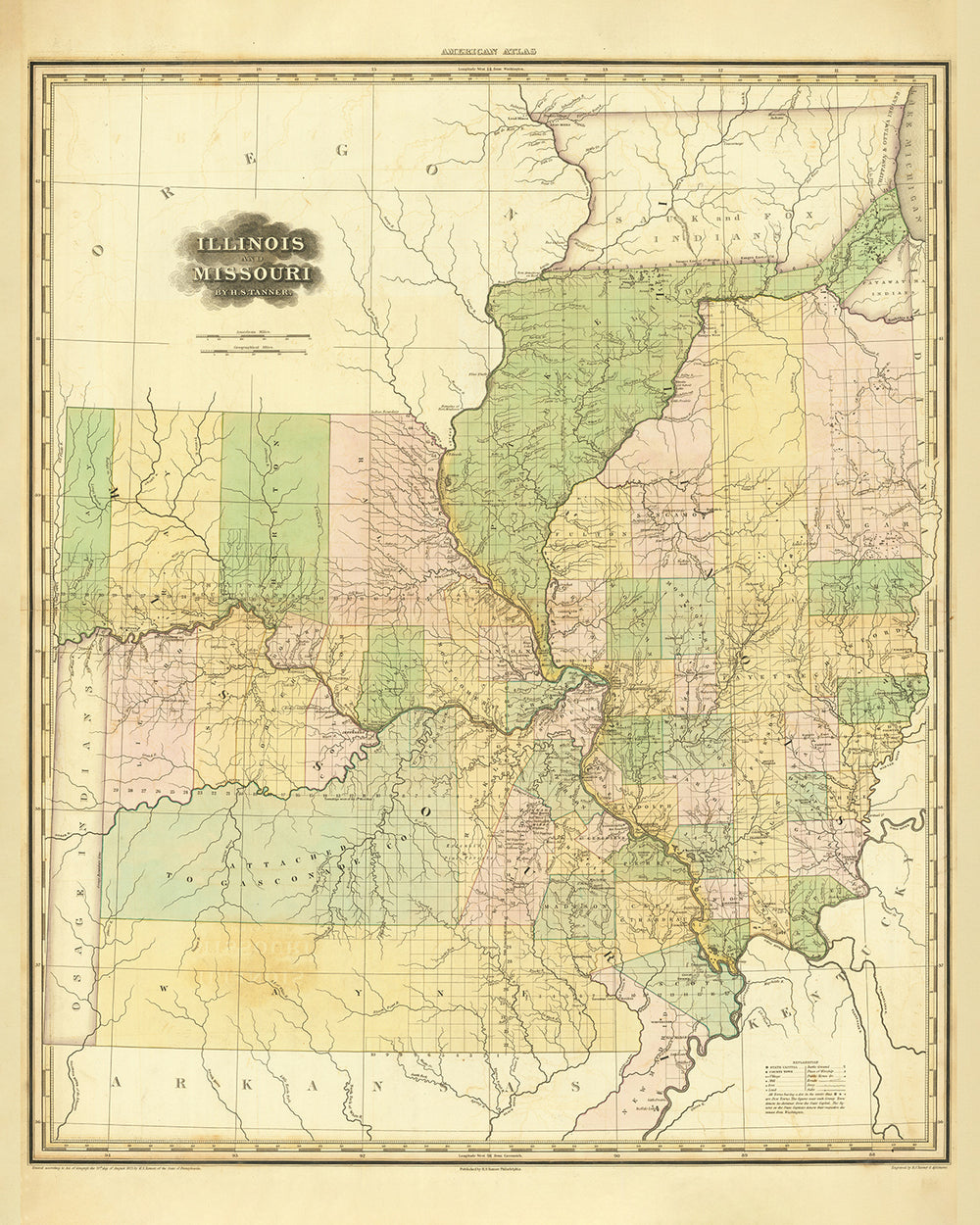 Die detailreiche Karte repräsentiert eine Ära der Erkundung, des Abenteuers und des Pioniergeistes. Sie ist reich an historischer Bedeutung und zeigt die rauen, unberührten Naturlandschaften und die sich entwickelnde Stadtentwicklung, die dem Betrachter einen Einblick in die Welt des frühen 19. Diese historische Karte von Illinois und Missouri ist eine eindrucksvolle Ergänzung für jedes Sammlerportfolio oder ein eleganter Blickfang für Ihr Zuhause oder Büro.