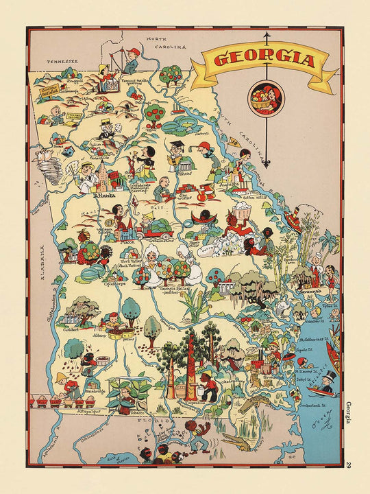 Ruth Taylor White, bekannt für ihre Arbeiten im Bereich der bildlichen Karten, bringt ihren charakteristischen Stil in diese Darstellung Georgias ein. Zusammen mit ihrem Mann, Frank Taylor White, schuf sie eine Reihe von Cartoon-Atlanten, die die Sichtweise der Amerikaner auf ihre eigene Geographie neu definierten. Ihr Ansatz ist sofort erkennbar: kräftige, gesättigte Farben, lebhafte Karikaturen und ein sanfter Humor, der zur Erkundung einlädt. Jede Landkreisgrenze ist sorgfältig gezeichnet, während die Illustrationen - die alles von geschäftigen Dampfschiffen bis zu ruhigen Kiefernwäldern darstellen - das Wesen der vielfältigen Landschaften und der geschichtsträchtigen Vergangenheit des Bundesstaates einfangen.