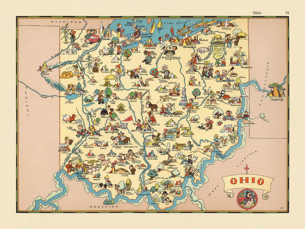 Bildliche Karte von Ohio von Ruth Taylor White, 1935: Columbus, Cleveland, Cincinnati, Industrie, Eisenbahnen