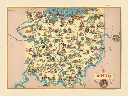 - Themen: Die Karte hebt stereotype und ikonische Szenen aus Ohio in den 1930er Jahren hervor, die die Kultur, Geografie und Wirtschaft des Bundesstaates zu dieser Zeit widerspiegeln.