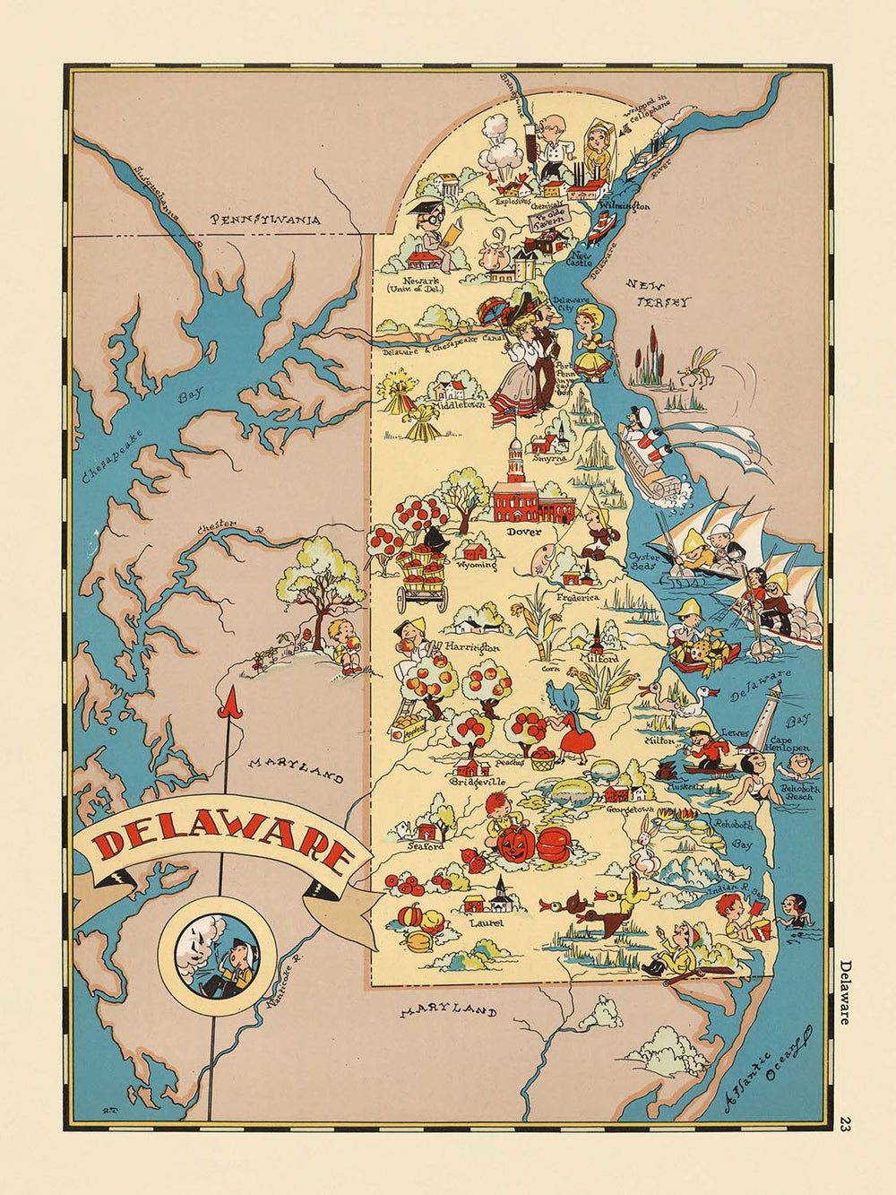 Bildkarte von Delaware von Ruth Taylor White, 1935: Wilmington, Dover, Delaware Bay, Strände, Erster Staat