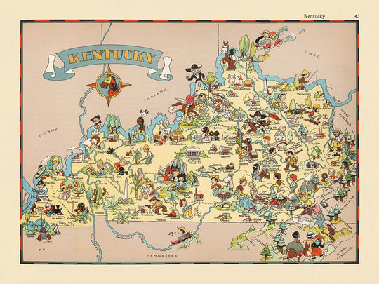 Was diese Karte auszeichnet, ist ihre Fähigkeit, die natürlichen und menschlichen Elemente Kentuckys sowohl mit Genauigkeit als auch mit Charme miteinander zu verweben. Große Flüsse wie der Ohio sind mit Radschleppern belebt, während die sanften Hügel und Täler des Staates mit Vieh und Musikern gespickt sind, die die Rhythmen der Bluegrass-Kultur hervorrufen. Anstatt sich auf spezifische historische Wahrzeichen oder Ereignisse zu konzentrieren, erfasst die Karte das breitere Gewebe des täglichen Lebens, von geschäftigen Städten bis zu ruhigen Farmlandschaften. Jede Szene ist mit einem Gefühl von Humor und Zuneigung dargestellt, was die Karte ebenso unterhaltsam zu erkunden macht wie informativ.