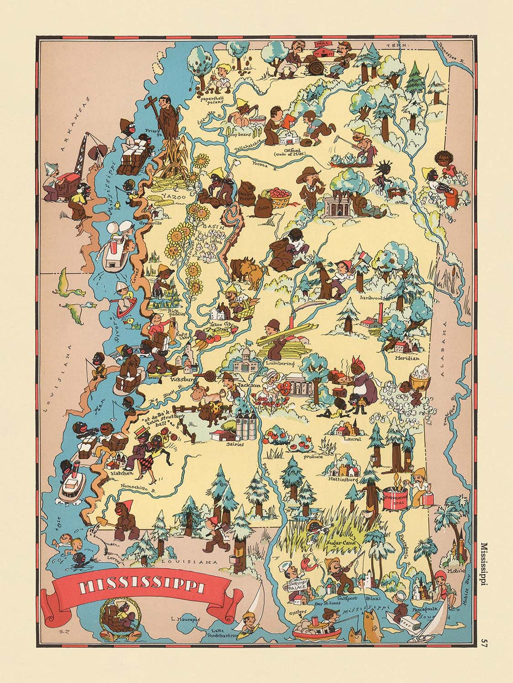 Bildkarte von Mississippi von Ruth Taylor White, 1935: Jackson, Gulfport, Mississippi River, Baumwollfelder, Dampfschiffe