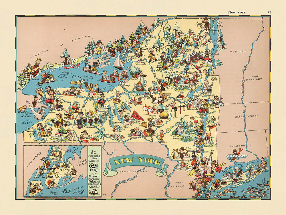 Über seine natürlichen Wunder hinaus feiert die Karte das kulturelle und wirtschaftliche Gefüge des Staates. Verspielte Illustrationen von Landwirtschaft, Milchkühen und geschäftigen Fabriken zollen New Yorks landwirtschaftlichem und industriellem Erbe Tribut. Freizeitaktivitäten – Angeln, Jagen, Skifahren – prägen die Landschaft und spiegeln die vielfältigen Möglichkeiten für Abenteuer und Freizeit im Bundesstaat wider. Die Präsenz von Ureinwohnerfiguren und Verweise auf die frühe Kolonialgeschichte bereichern die Erzählung weiter und bieten einen nuancierten Einblick in die Schichten menschlicher Erfahrungen, die New York geprägt haben.