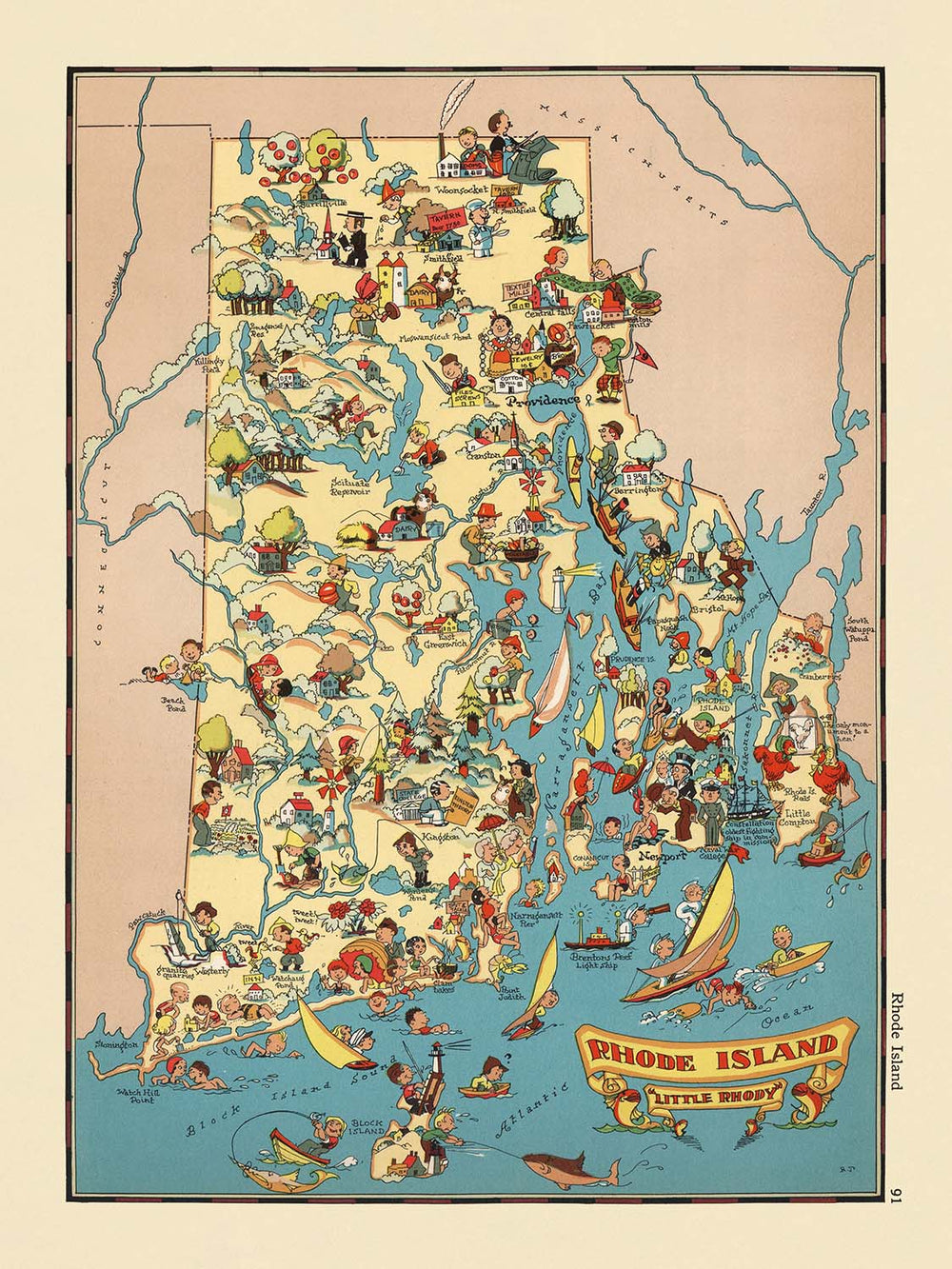 Bildkarte von Rhode Island von Ruth Taylor White, 1935: Providence, Newport, Narragansett Bay, Leuchttürme, Textilfabriken