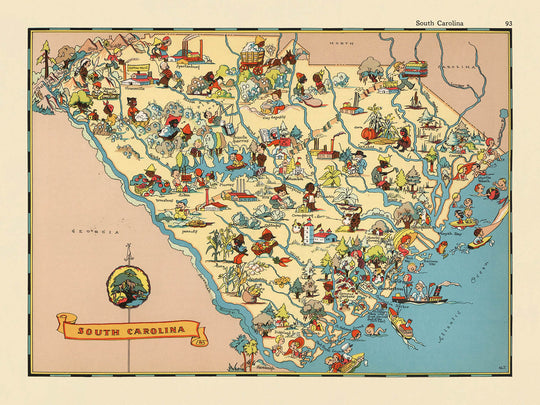 Betreten Sie die lebendige Welt Amerikas der 1930er Jahre mit „South Carolina“, einer fesselnden bildlichen Karte, die ursprünglich 1935 von Ruth Taylor White erstellt wurde. Dieses skurrile kartografische Schatzstück, Teil einer gefeierten Serie von Staatskarten, bietet ein reizvolles und aufschlussreiches Fenster in den Palmetto-Staat, wie er vor fast einem Jahrhundert wahrgenommen wurde. Der ursprüngliche Titel der Karte, einfach „South Carolina“, spricht für den Fokus auf die einzigartige Identität des Staates und lädt die Betrachter ein, seine Landkreise, Grenzen und reichhaltigen Charakter durch eine Vielzahl von charmanten Illustrationen zu erkunden. Jeder Zentimeter dieser Karte ist durchdrungen von der Energie und dem Optimismus ihrer Zeit, was sie zu einem faszinierenden Artefakt für Sammler und Liebhaber der amerikanischen Geschichte macht.