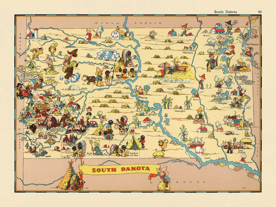 Bildkarte von South Dakota von Ruth Taylor White, 1935: Sioux Falls, Black Hills, Mount Rushmore, Missouri River, Badlands