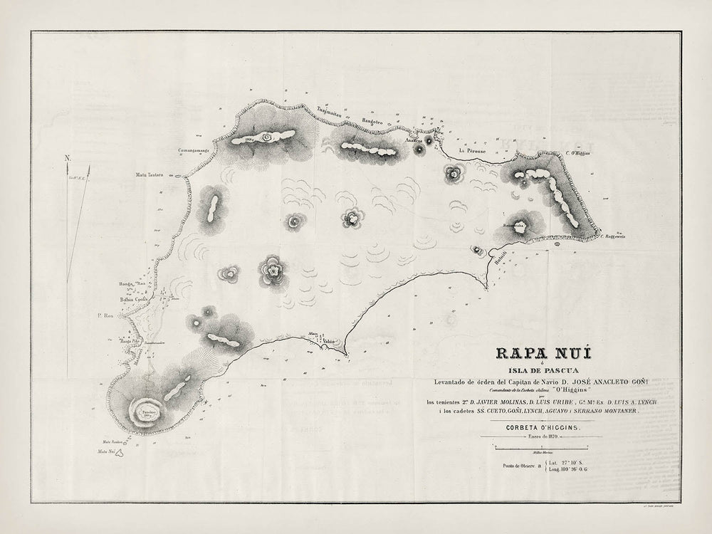 Rapa Nuí oder Isla de Pascua, eine fesselnde nautische Karte, die von Francisco Vidal Gormaz im Jahr 1870 erstellt wurde, bietet einen faszinierenden Einblick in die bewegte Vergangenheit von Osterinsel. Diese Schwarz-Weiß-Lithografie, Teil eines größeren Atlas, der sich auf die hydrographische Erkundung Chiles konzentriert, ist ein Zeugnis von Gormaz' akribischer Detailgenauigkeit und seinem Engagement, die komplexe Geografie dieser abgelegenen Insel festzuhalten. Die Karte illustriert wunderschön die Topografie, Entwässerung und Küstenlinien der Insel und bietet einen umfassenden Blick auf ihre natürlichen Merkmale.