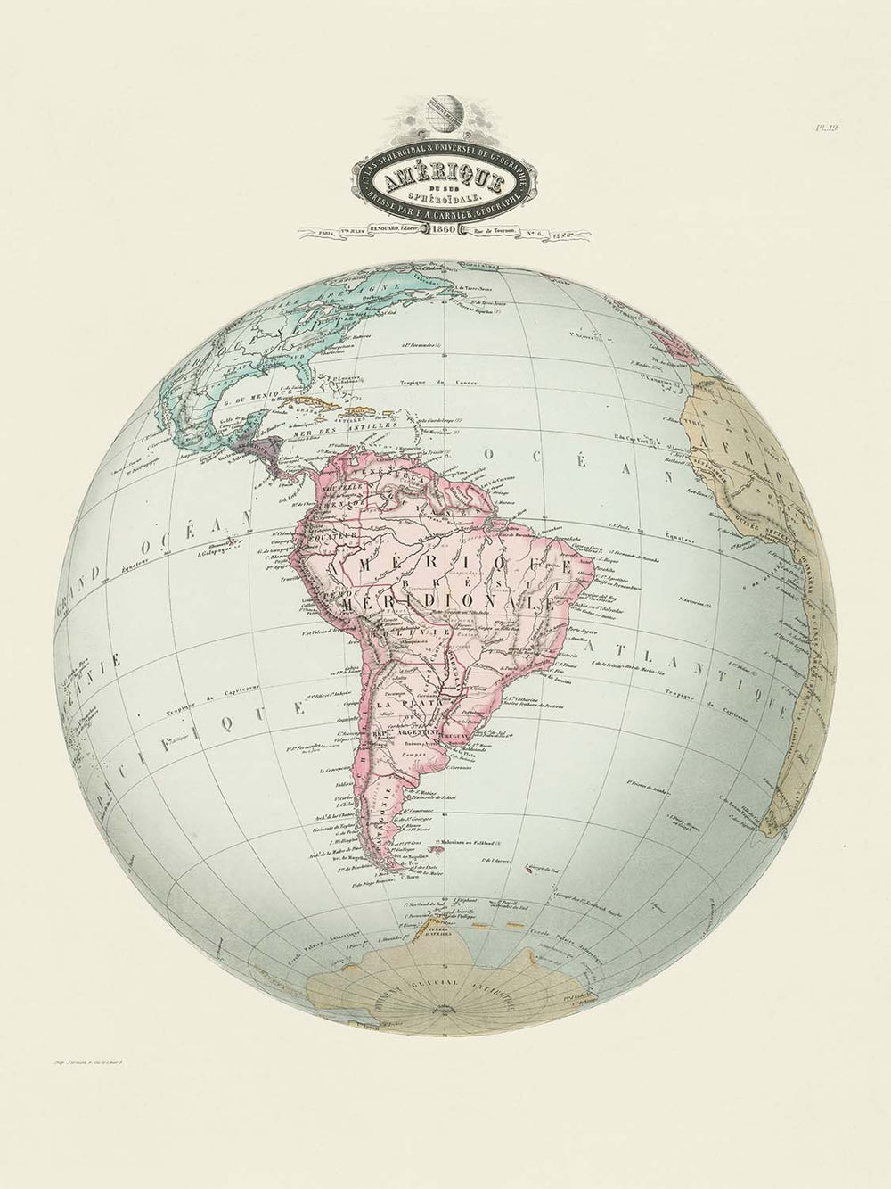 Alter sphärischer Karte von Südamerika von Garnier, 1860