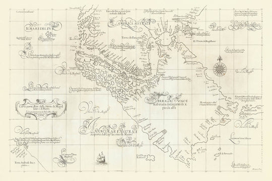 Zur Intrige trägt bei, dass die Karte die Mythen und Legenden bewahrt, die die frühe Erkundung prägten. Eine Notiz, die auf die angeblichen Riesen von Patagonien verweist, eine Geschichte, die aus Magellans erster Umseglung hervorging, deutet auf die Mischung aus Fakt und Folklore hin, die diese gefährlichen Reisen begleitete. In der unteren linken Ecke fügt Dudley den schwer fassbaren Südkontinent oder Terra Australis hinzu, basierend auf Berichten von Sir Francis Drake – den Dudley persönlich kannte. Diese spekulative Landmasse unterstreicht das Staunen der Ära und den anhaltenden Glauben an unentdeckte Welten jenseits der bekannten Meere.
